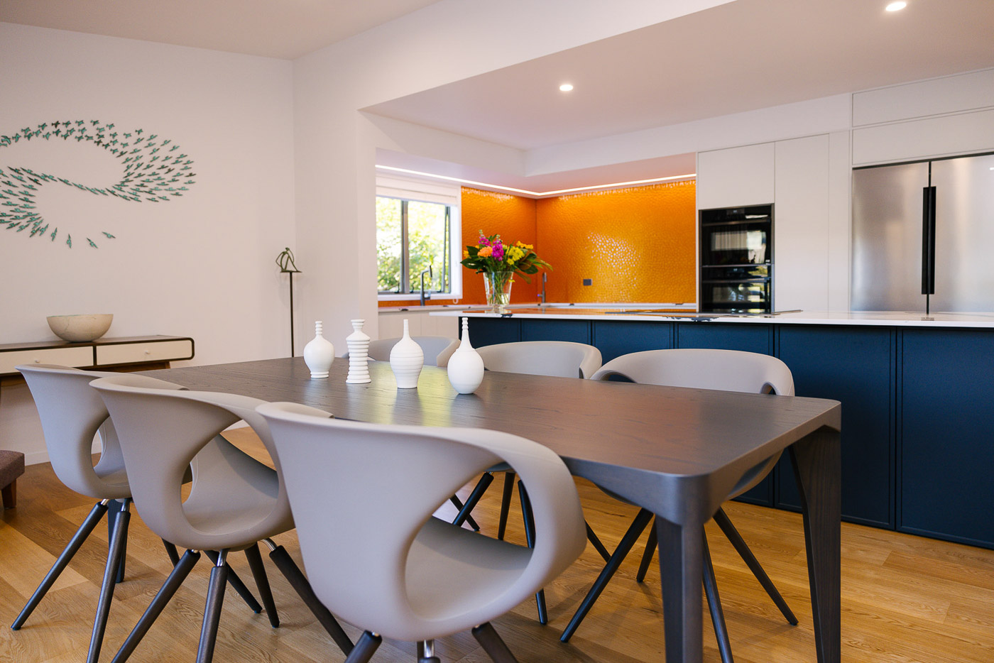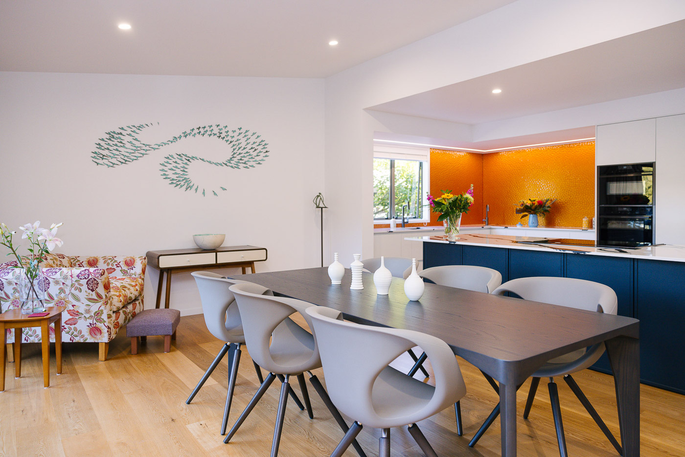 While the kitchen had already been selected, the bold orange splashback felt like a leap of faith. We helped them confidently commit to the choice, then developed a layered interior scheme that allowed this vibrant feature to feel intentional and beautifully balanced.