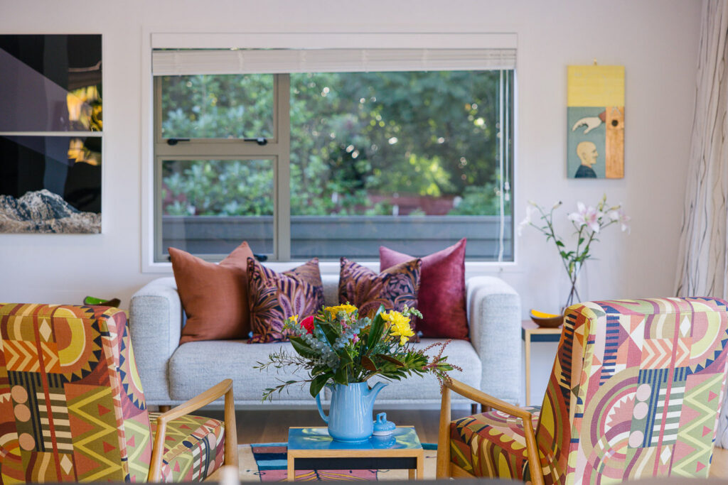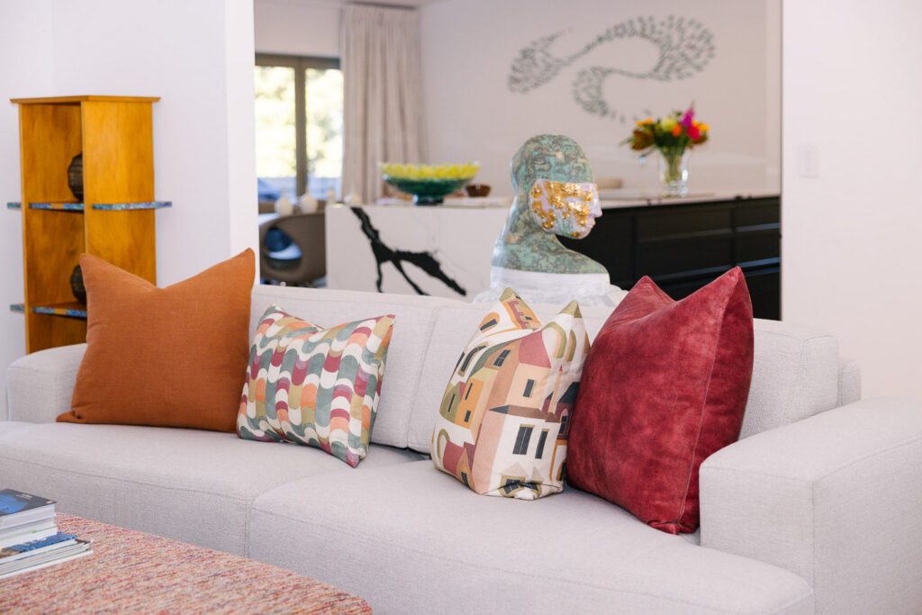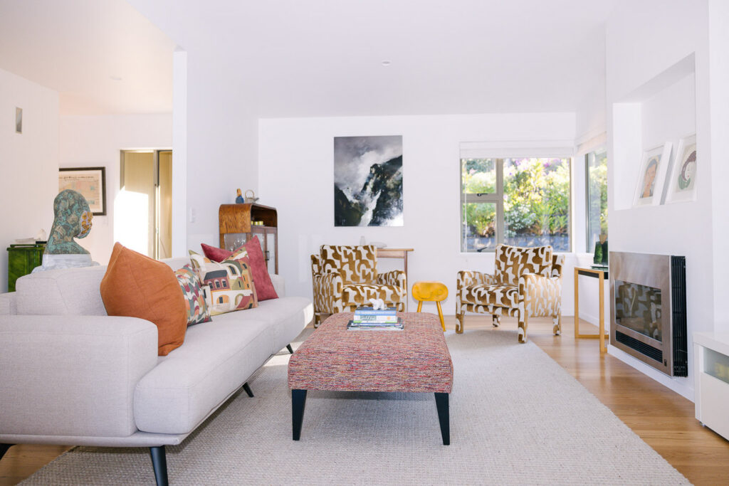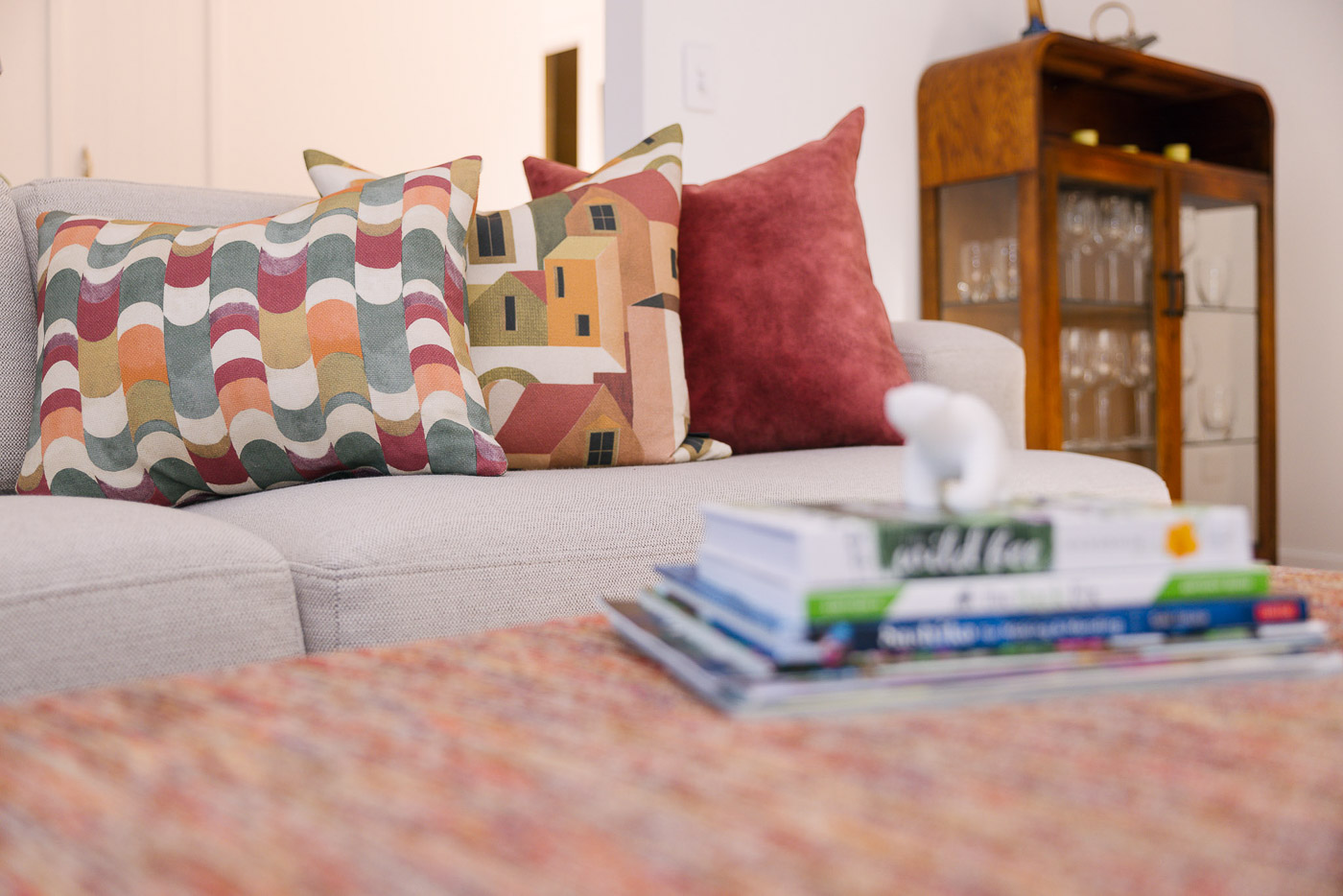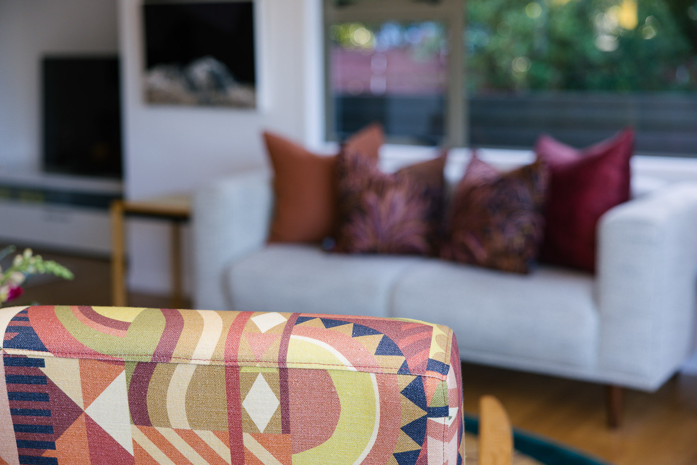 Incorporating existing pieces was an important part of the brief — including a treasured rug, colourful side tables, and an impressive art collection. New dining and lounge furniture was specified and sourced, custom curtains were manufactured, beloved pieces were reupholstered, and each space was finished with thoughtfully selected rugs and bespoke cushions.