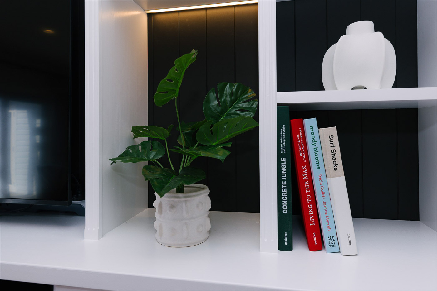 During the initial site visit, it became clear the home had far greater potential. We recommended a series of architectural enhancements — adding architraves to windows and doors, tongue-and-groove panelling to selected rooms, and a custom built-in bookcase for the day lounge. Several bedrooms were reconfigured to improve space and flow, and the primary ensuite underwent a full renovation. The clients embraced the vision, allowing the home to evolve from a standard build into a truly special retreat.